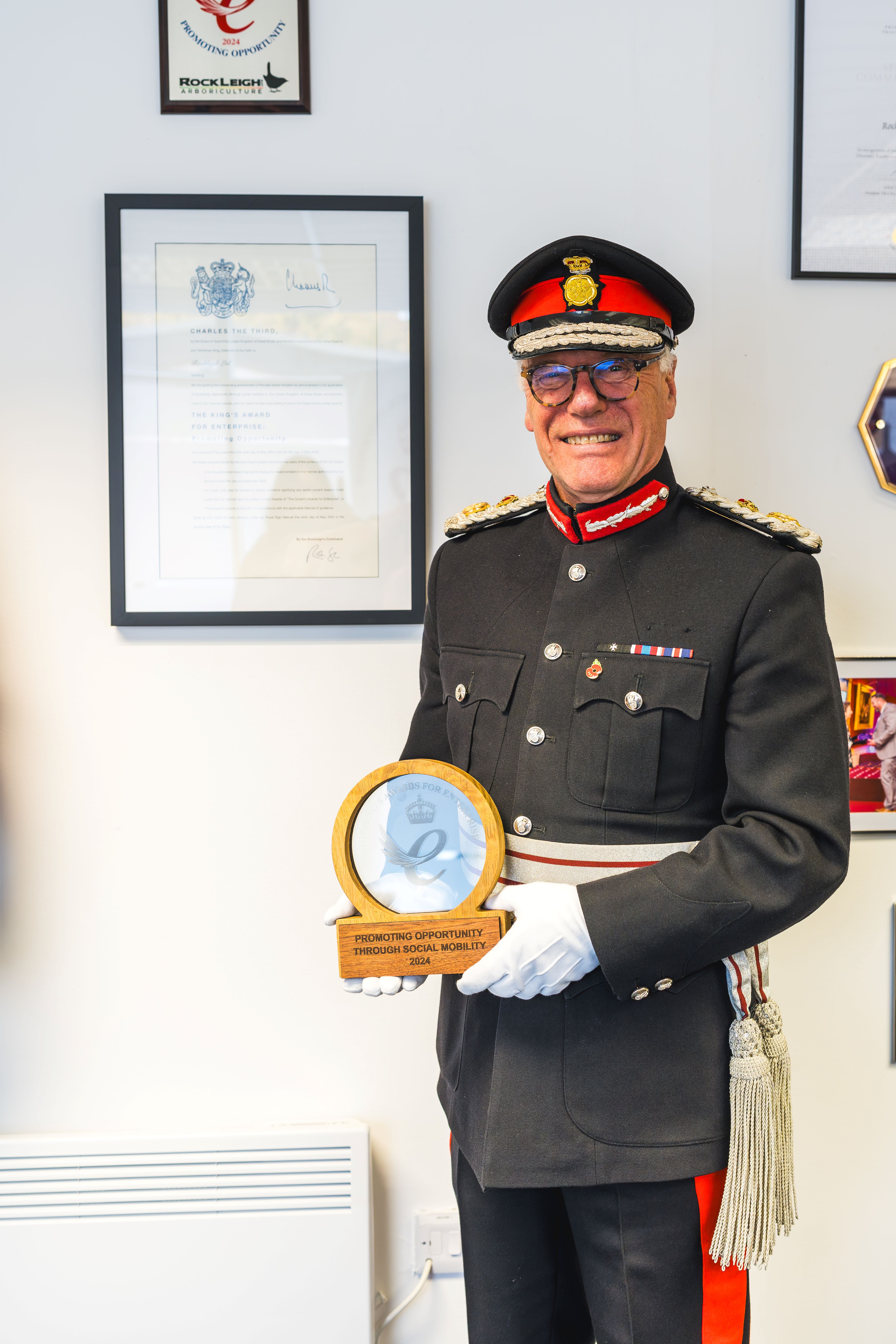 In 2024, Rockleigh received the highest honour of 'The Kings Award for Enterprise' for social mobility. There was only 9 companies who won in this category. Renée attended the ceremony and was spoken to by the HRH King Charles, who said 'we need more tree surgeons'. The Lord Lieutenant later attended the Rockleigh unit presented the team with the Royal Warrant.
